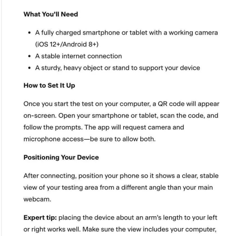 Expert tip: placing the device about an arm’s length to your left or right works well. Make sure the view includes your computer, keyboard, mouse, hands, and side profile. On test day, the proctor will guide you to the ideal setup.